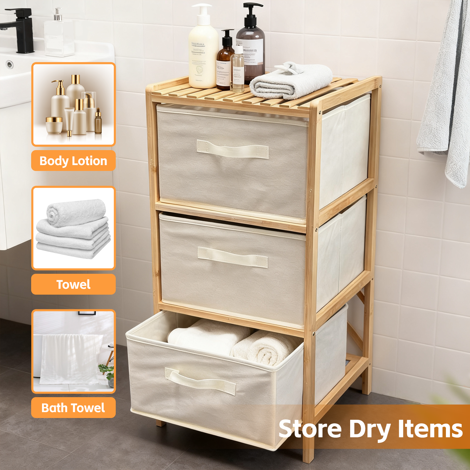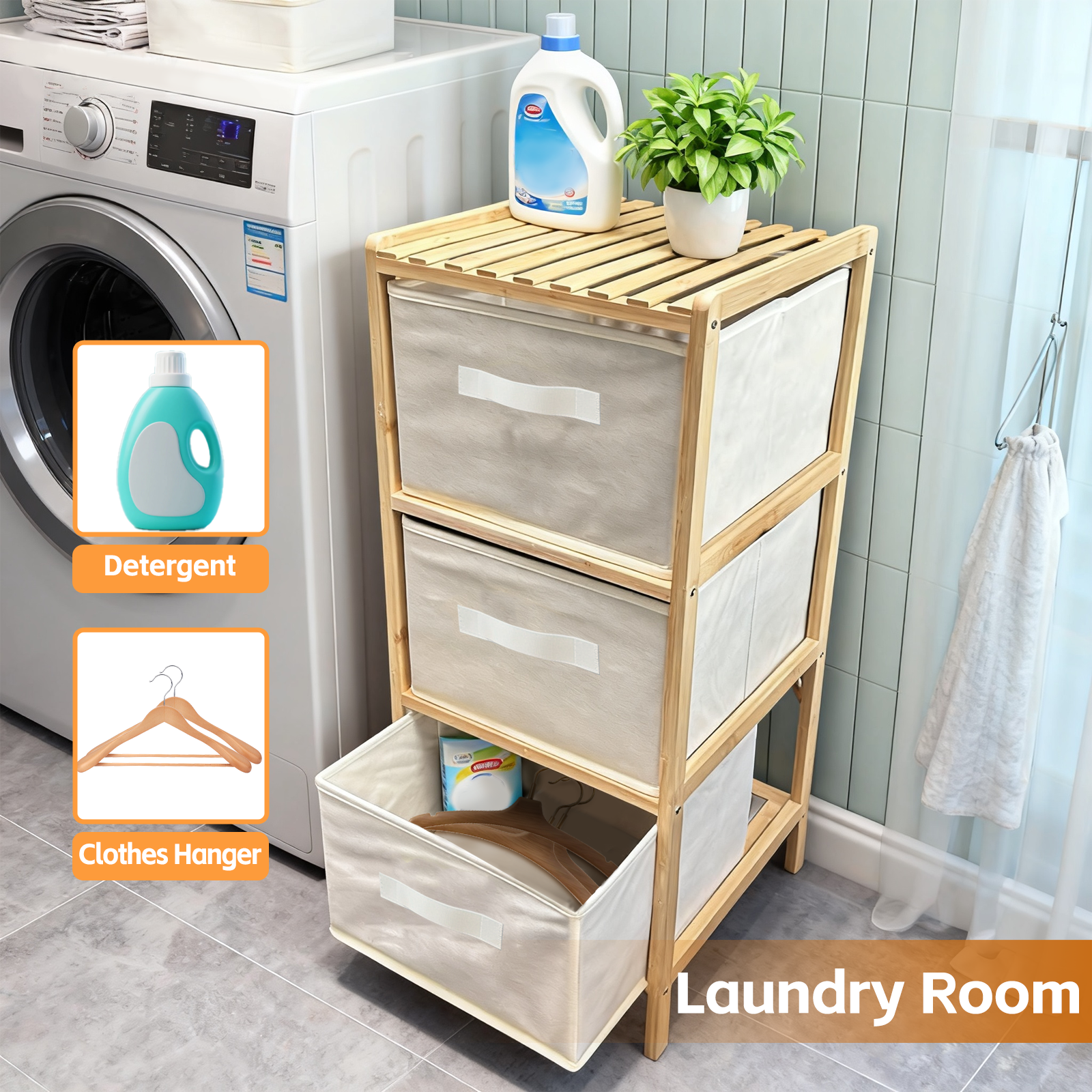 Keep your home neat and stylish with this 3-Tier Bamboo Storage Cabinet, designed for versatile use in any room — from bedroom and bathroom to laundry and living spaces. Crafted from natural bamboo and non-woven fabric drawers, it blends functionality with a warm, minimalist aesthetic that complements any décor.