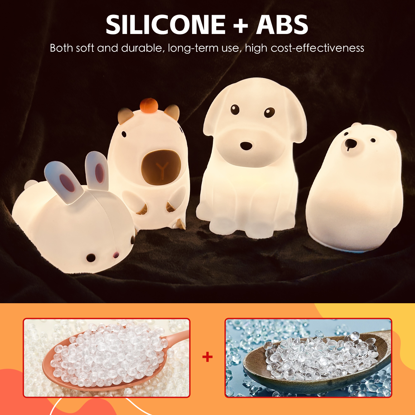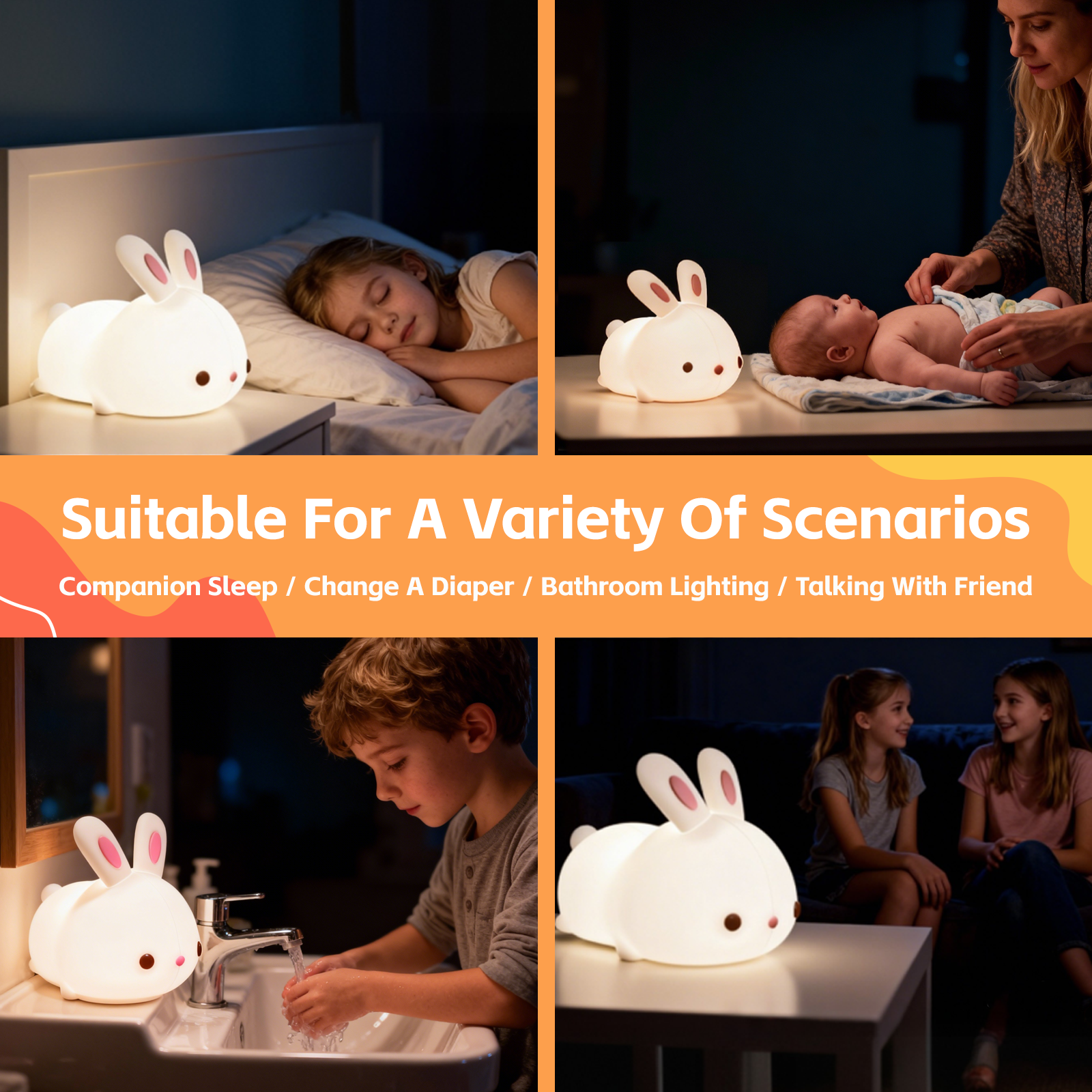This Bunny-shaped silicone night light delivers a soft, calming glow that helps ease nighttime fears and adds a touch of cuteness to any room. Made from high-quality silicone + ABS materials, it’s durable, safe to touch, and perfect for everyday use.