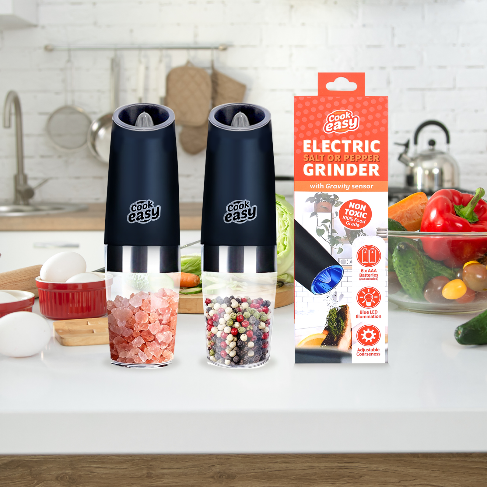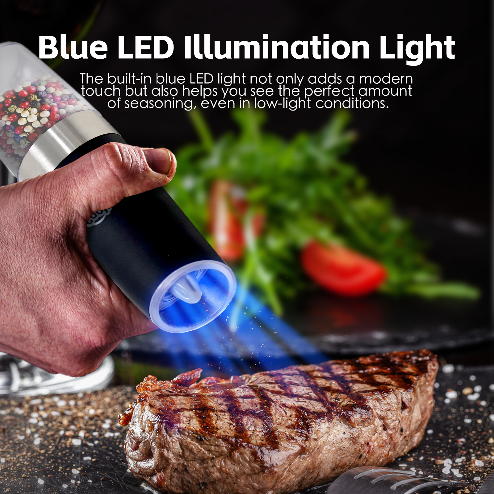 The built-in LED light provides a soft, yet bright illumination, ensuring you can accurately gauge the amount of salt, pepper of other spices you're adding to your dish, even in low-light settings.