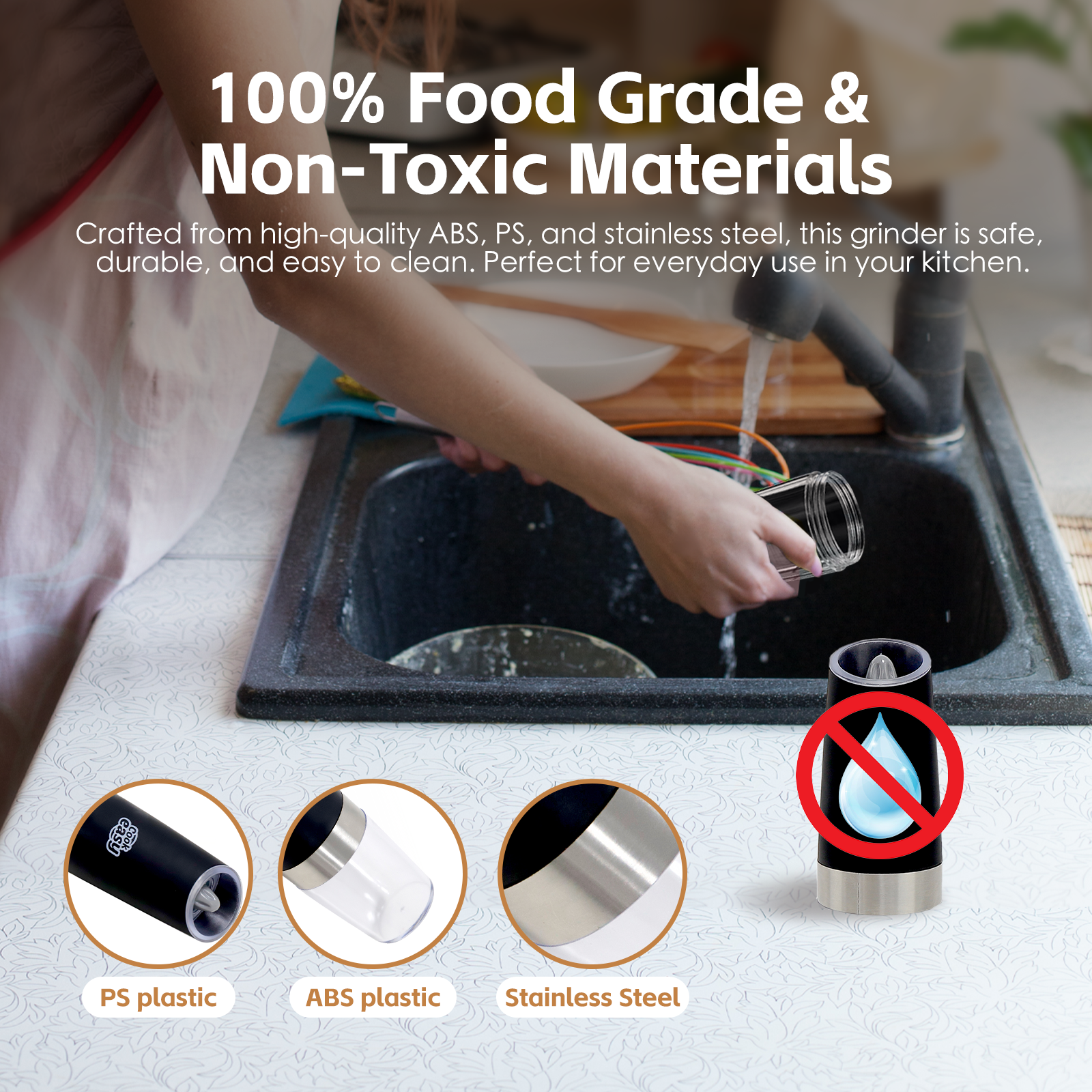 The grinder features a BPA-free transparent acrylic container, allowing you to easily see the remaining spices and quickly identify which spicy is inside.